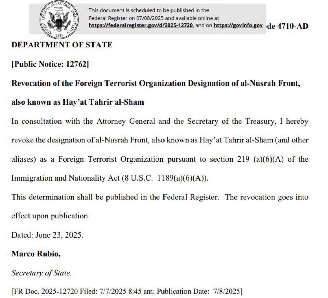 HTŞ əvvəllər “Əl-Qaidə” terror şəbəkəsinin Suriya qolu kimi tanınan “Nusra Cəbhəsi” adı altında fəaliyyət göstərmişdi. 2017-ci ildə adını dəyişərək indiki “Hayat Tahrir əş-Şam” formasını almış və daha “yerli” bir imic yaratmağa çalışmışdır. Qruplaşma illər ərzində müxtəlif transformasiyalardan keçərək, beynəlxalq ictimaiyyətin nəzərində müəyyən legitimlik qazanmağa can atmışdır. ABŞ Dövlət Katibi Marko Rubionun 23 iyun tarixli rəsmi yazısı, çərşənbə axşamı günü rəsmi elandan əvvəl Federal Reyestrin ilkin baxışında dərc edilib. Bu sənəd, təşkilatın hüquqi statusunun dəyişdirilməsi barədə rəsmi bəyanatı özündə ehtiva edir və Vaşinqtonun bu addımı ilə bağlı dərin analitik baxışları ortaya qoyur.